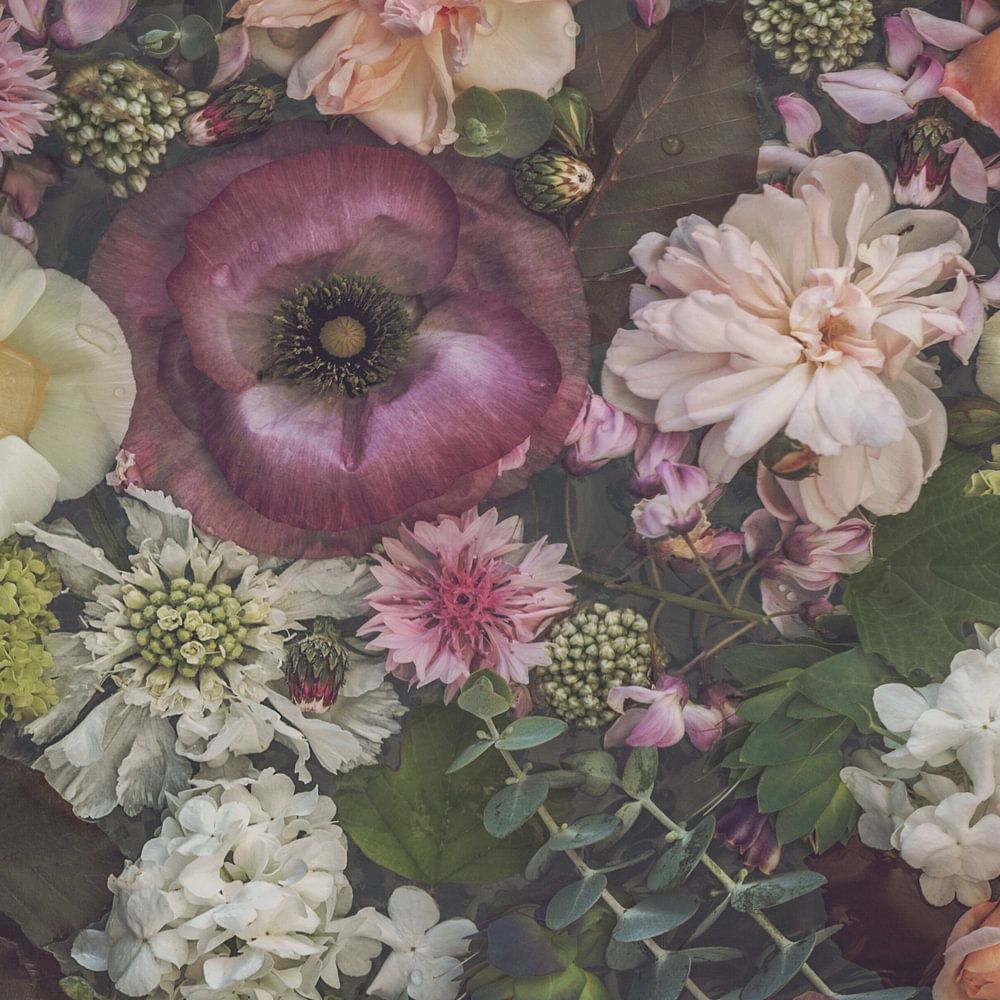 Verschiedene Rosen, Mohnblumen, Hortensien und andere botanische Elemente, die in Wasser getaucht sind oder darin treiben.