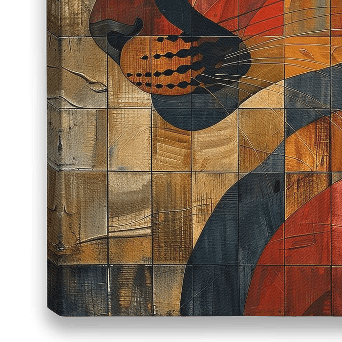 Details: Tierbild, Katzenbild, moderne Kunst, warme Farben, abstrakt, schwarz, orange, braun, gelb, geometrisch
