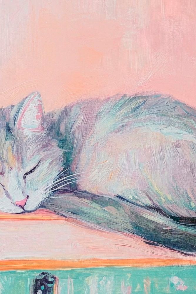 Sanft umhüllt von einem sanften Rosaton, ruht eine graue Katze verträumt auf einem Stapel bunter Bücher. Ihr weiches Fell und der geschwungene Körper verleihen der Szene eine friedliche Wärme, während die Bücher Geschichten erzählen, die nur darauf warten, entdeckt zu werden. Ein harmonisches Zusammenspiel aus Ruhe und Fantasie, das zum Verweilen einlädt.