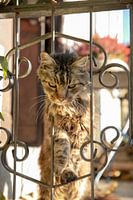 Die magere Katze kriecht durch die Gitterstäbe
