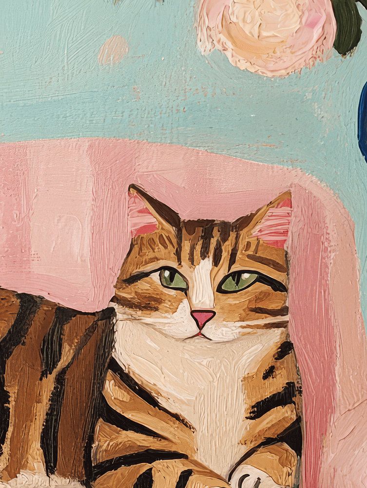 Dieses Bild strahlt das ultimative Katzenglück aus. Eine Katze liegt bequem auf einem weichen Stuhl, offensichtlich in ihrem Zen-ähnlichen Schlummer. Die Blumen im Hintergrund scheinen mitzuträumen und sind stille Zeugen dieser Siesta. Mit dieser entspannten Haltung zeigt diese Katze, wie man das Leben am besten lebt: faulenzen, umgeben von Blumen und hübschen Mustern.
