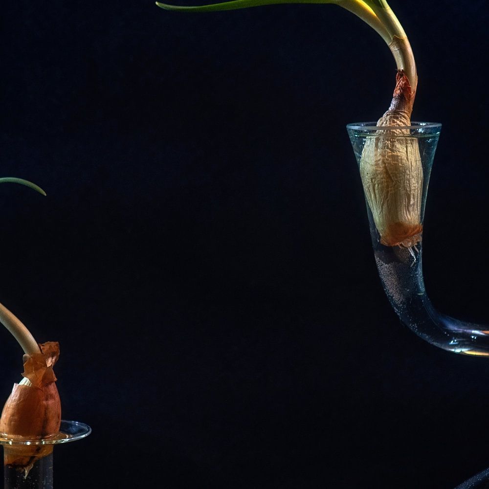 Staatsporträt von zwei sprießenden Schalotten. Schalotten sind kleine, längliche Zwiebeln mit einem zarten, milden Geschmack. Eine unterschätzte Zwiebelsorte, daher dieser Scherz: ein echtes Porträt mit Studiolicht von diesen keimenden Schalotten, bevor ich sie in den Garten gepflanzt habe. Eigentlich eine Art Stillleben.