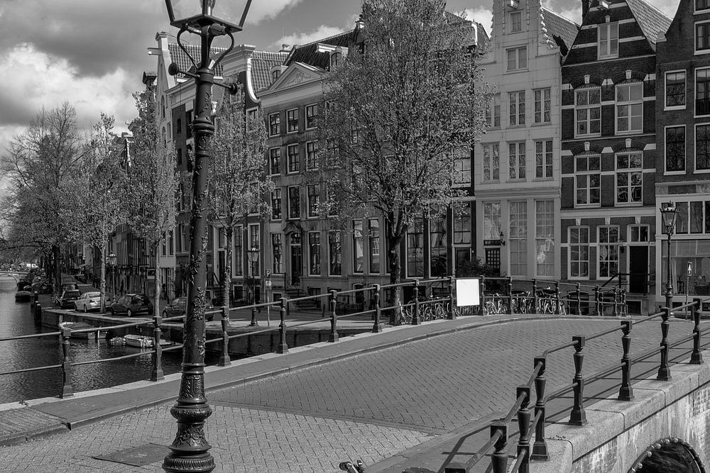 Einer der stimmungsvollsten Teile Amsterdams ist hier zu sehen. Die Brücke an der Kreuzung der Keizersgracht und der Leidsegracht. Im Hintergrund die Grachtenhäuser aus dem 17. Im Vordergrund die handgefertigten Laternenpfähle und die am Brückengeländer geparkten Fahrräder. Tourboote kommen und gehen, um Touristen die Schönheit von Amsterdam vom Wasser aus zu zeigen. Die Keizersgracht ist Teil des Amsterdamer Grachtenrings und gehört zum UNESCO-Weltkulturerbe.