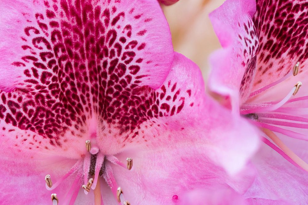 Herz der rosa Blüte eines Rhododendrons mit Narben, Staubgefäßen und Staubbeuteln.