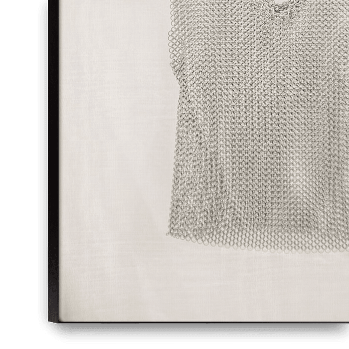 Ein Bild von einem Kettenhemd, das an einer Holzkonstruktion und Schnüren hängt. Die Art der Aufhängung, der Ausschnitt und die Pastellfarben machen dieses Bild zu einem Kunstwerk an sich.