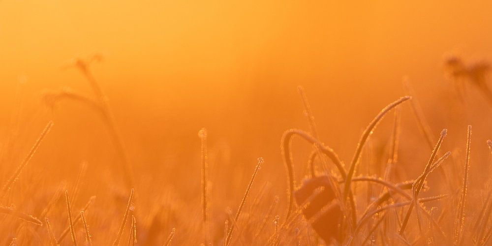 Am Königstag färbte sich der Himmel orange. Die Kiebitzblumen blühten und funkelten im Sonnenlicht. Auf den Blumen sind Eiskristalle zu sehen. nebel und Frost ergeben Frost. Ein schöner Anblick.