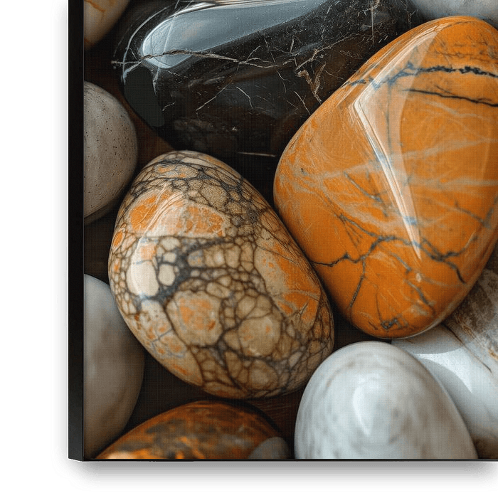 Schöne Collage aus glänzend polierten Flusssteinen in neutralen Erdtönen. Schönes Stillleben, das einen wieder über die Schönheit der Natur staunen lässt. Sehr hübsch als kleines Kunstwerk, aber sehr groß fertig ein richtig cooler Blickfang.