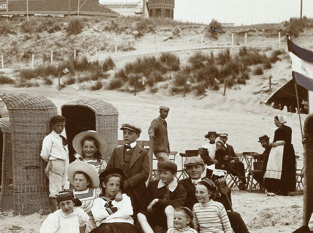 Strand von Zandvoort vom Meer aus gesehen. Im Hintergrund das Kurhaus. Im Vordergrund eine Gruppe von Kindern, die in Strandkörben sitzen.