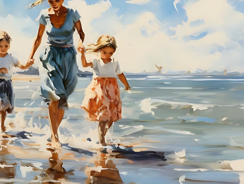 Das Gemälde von Jozef Israëls stellt eine idyllische Szene am Meer dar. Kinder spielen fröhlich mit ihrer Mutter im Meer, umgeben von der salzigen Brise und dem Rauschen der Brandung. Die Atmosphäre strahlt Unbeschwertheit und jugendliche Unschuld aus. Der Himmel ist in warmes Sonnenlicht und blauen Himmel getaucht, und das Meer erstreckt sich bis zum Horizont. Israëls hat diesen Moment der reinen Freude und Entdeckung in einem zeitlosen Bild festgehalten.