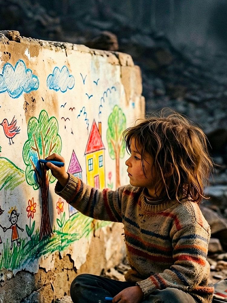 Durch unschuldige Hände nimmt eine andere Welt Gestalt an. Dieses Werk fängt eine Hoffnung ein, die von Konflikten unberührt bleibt – eine Erinnerung daran, dass Frieden in den einfachsten Visionen beginnt, an die wir glauben wollen