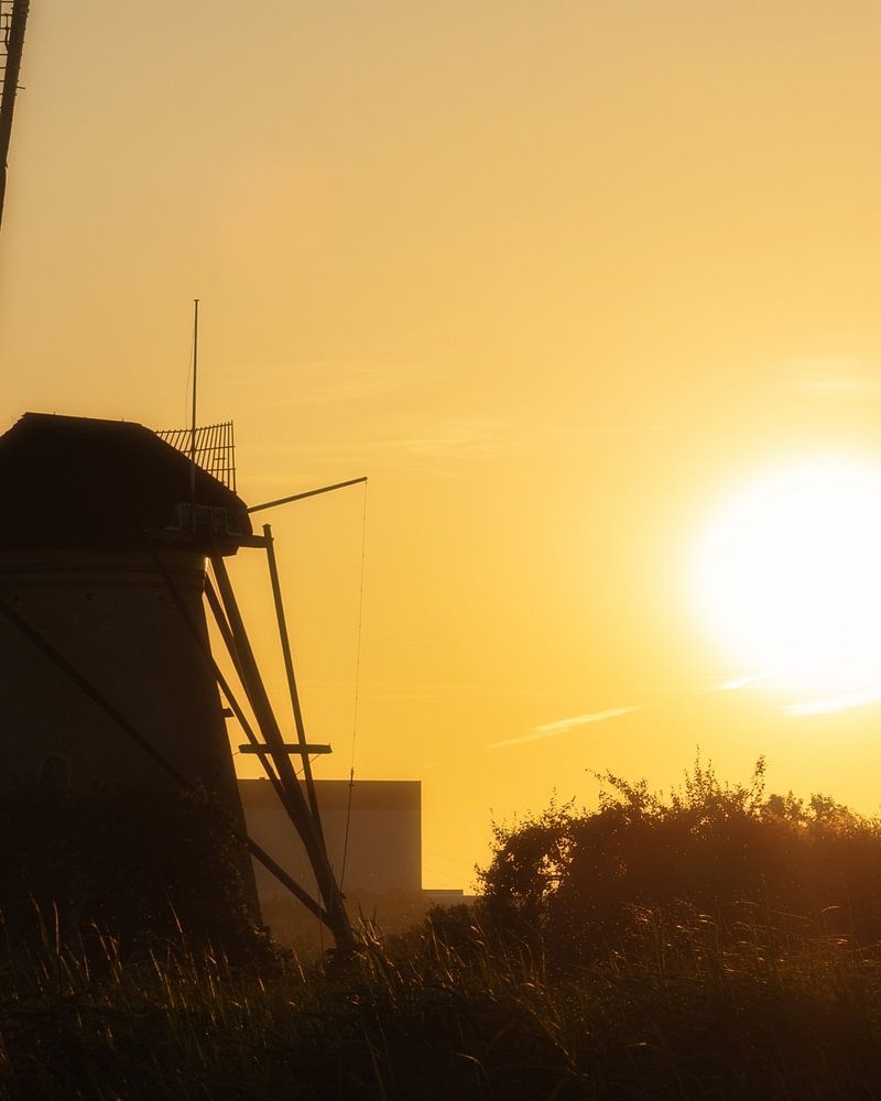 Ein schöner gelber Sonnenuntergang über Kinderdijk mit der Silhouette einer Windmühle.