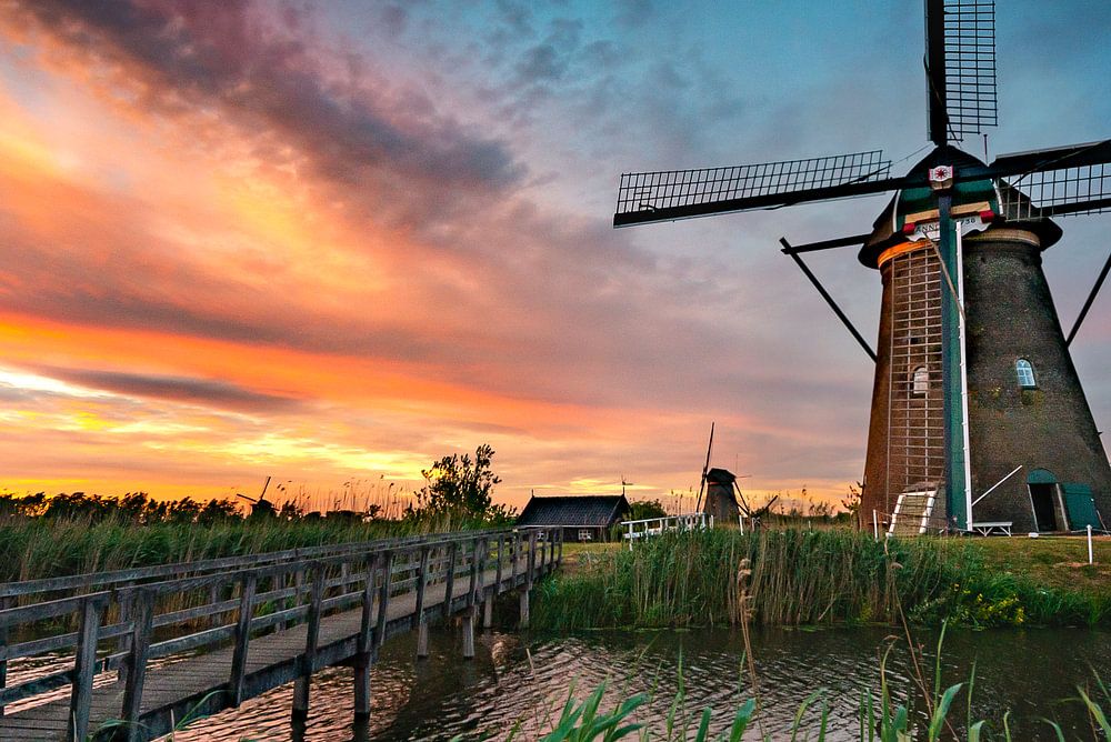 Wunderschöner farbenfroher Sonnenuntergang in Kinderdijk fotografiert.