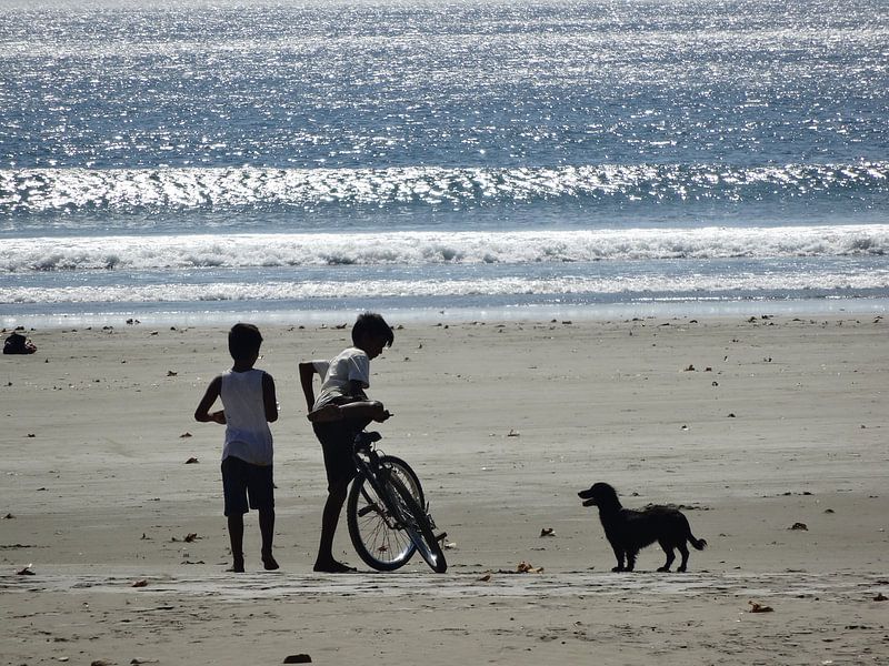 strand Nicaragua. Kinderen met de fiets en hun hondje