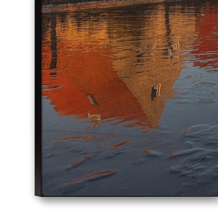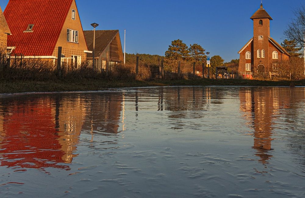 Die starken Regenfälle haben an mehreren Stellen in den Dünen kleine Seen entstehen lassen. Das ist an sich nicht so schlimm, es sei denn, Ihr Haus steht genau dort. Hier in Bergen aan Zee war das auch der Fall. Die Feuerwehr setzte einen 500 Meter langen Schlauch ein, um so viel Wasser wie möglich ins Meer zu pumpen. Aber offenbar war etwas Wasser übrig geblieben und hatte einen schönen kleinen See gebildet, an dessen Fuß die Friedenskirche liegt. Als es zu frieren begann, spiegelten sich die kleine Kirche und die angrenzenden Häuser wunderschön in dem glatten Eis. Zusammen mit der untergehenden Wintersonne konnte ich ein schönes Foto machen.