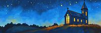 Kirche im Nachtlicht - Dieses nächtliche Landschaftsgemälde zeigt eine kleine, einsame Kirche im warmen Licht beleuchteter Fenster vor dem Hintergrund eines Sternenhimmels und sanfter Hügel, die eine Atmosphäre des Friedens und der Kontemplation hervorrufen.