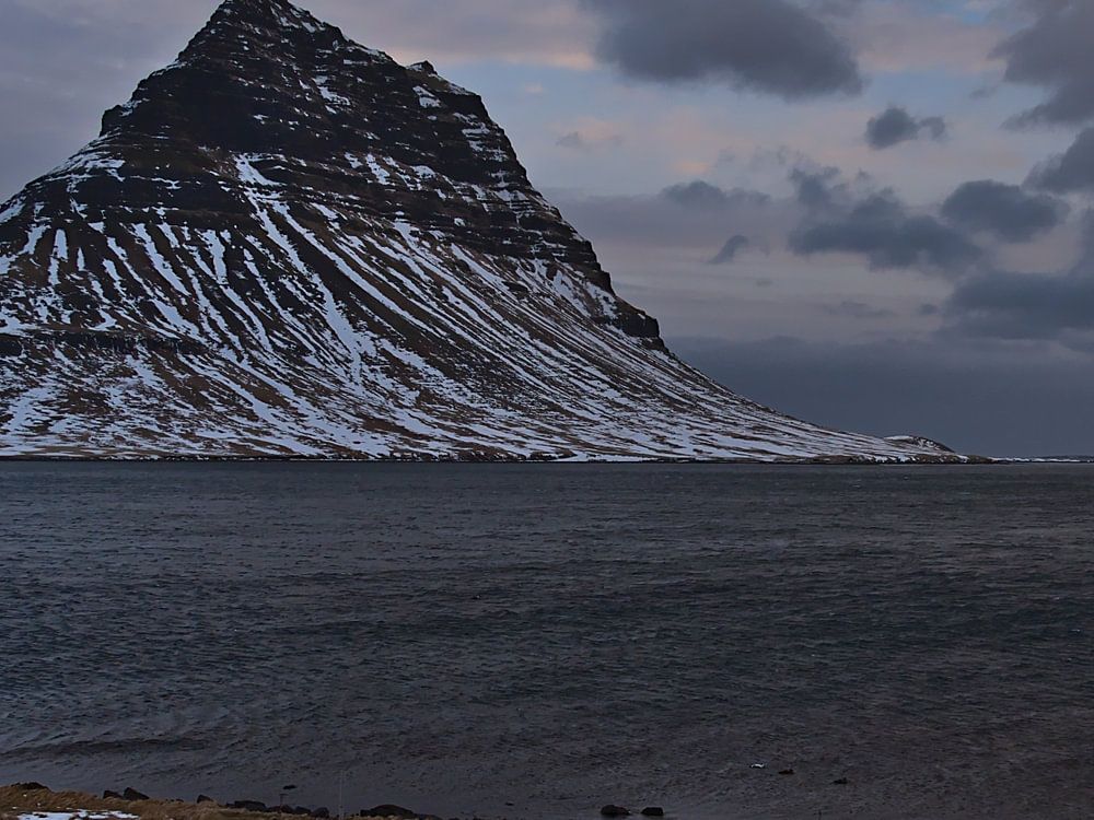 Blick auf den berühmten Berg Kirkjufell mit schneebedeckten Felsen an der rauhen Küste der Halbinsel Snæfellsnes im Westen von Island im Winter im Abendlicht an einem wolkigen Tag.