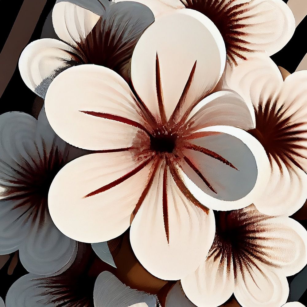 Opart Bild von Kirschblüten in Weiß auf einem organischen Hintergrund aus schwarzen und weißen Streifen. Hintergrund und Vordergrund gehen ineinander über.