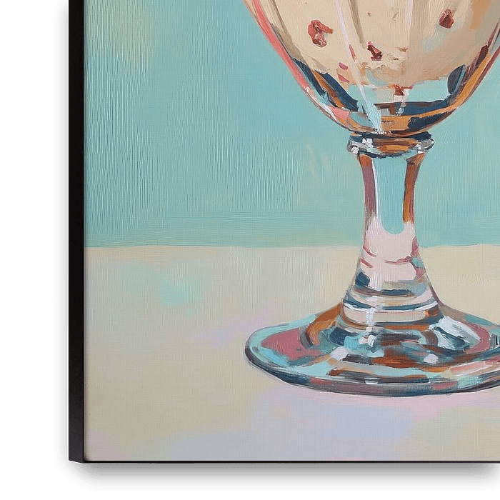 Kirschsorbet - Dieses Gemälde zeigt einen reich gefüllten Eisbecher mit Kugeln aus hellrosa Eiscreme, gekrönt mit einer großzügigen Menge roter Kirschen, serviert in einem klassischen Glasbecher mit dem Schatten des Glases im Hintergrund.