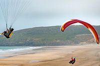 Entlang der Dünen von Surtainvilles weitem Strand, schwimmen die Kitesurfer mit ihren bunten Fallschirmen über dem Strand, mit dem Atlantik-Hintergrund.