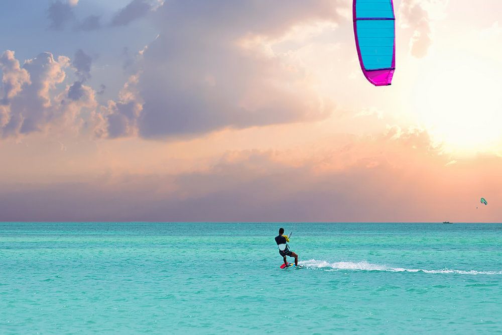 Kitesurfen bei Sonnenaufgang auf Aruba in der Karibik