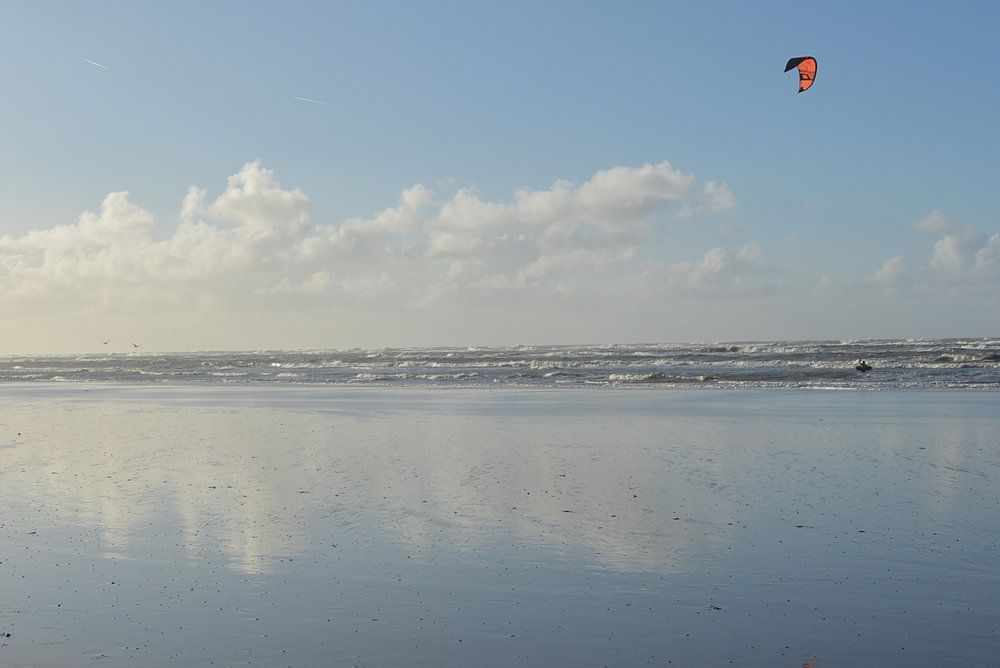 Kijken naar kiten op zee met blauwe lucht, wind en laagwater. Een persoon staat links te kijken naar de sport in de lucht. De kite is in de weerspiegeling terug te vinden.