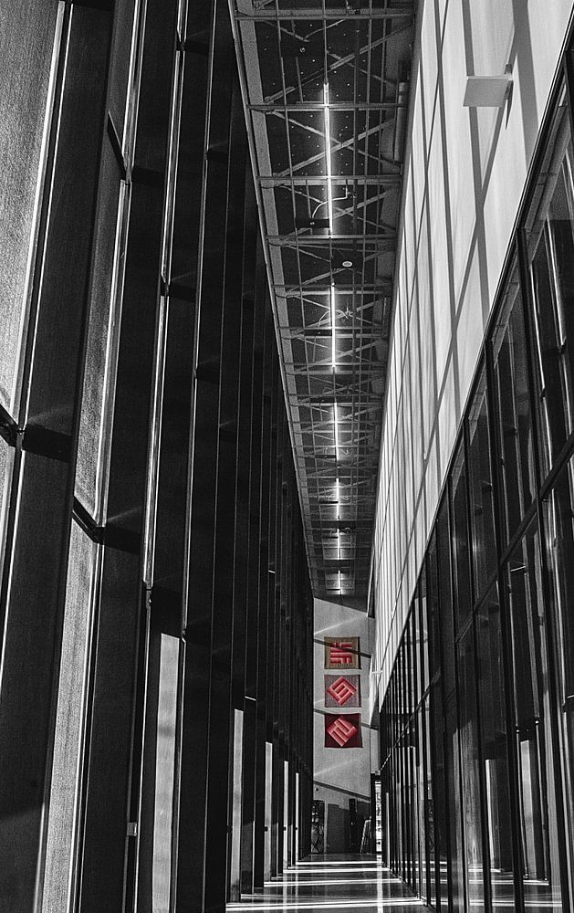 Für mein Fotoprojekt Tilburg Anders fotografiere ich Gebäude und Orte in Tilburg, an die meine Mutter eine besondere Erinnerung hat. Meine Mutter arbeitete an der Hochschule für angewandte Wissenschaften in Tilburg, der heutigen Universität Tilburg. Als ich dort herumspazierte, wurde meine Aufmerksamkeit von dem neuesten Gebäude auf dem Gelände, dem Cube, angezogen. Ein wunderschönes, schlichtes Gebäude in Form eines quadratischen Kastens. Drinnen gab es eine Lichtshow. Die Sonne schien durch die Fenster, die Bildschirme versuchten, das Licht zu blockieren. Die TL-Lampen beleuchteten den oberen Teil, der von den Bildschirmen verdeckt war. Ich habe zunächst versucht, die Linien gerade zu ziehen, aber irgendwann habe ich gemerkt, dass die Objektivverzerrung dem Foto ein originelles Aussehen verleiht. Um die Linien noch mehr hervorzuheben, habe ich das Foto in Schwarz-Weiß umgewandelt. Am Ende des Korridors hing jedoch ein Wandteppich, der im Textielmuseum gewebt wurde. Um die Geschichte Tilburgs lebendig zu halten, habe ich mich dafür entschieden, die Farben des Wandteppichs bei der Fotobearbeitung beizubehalten.