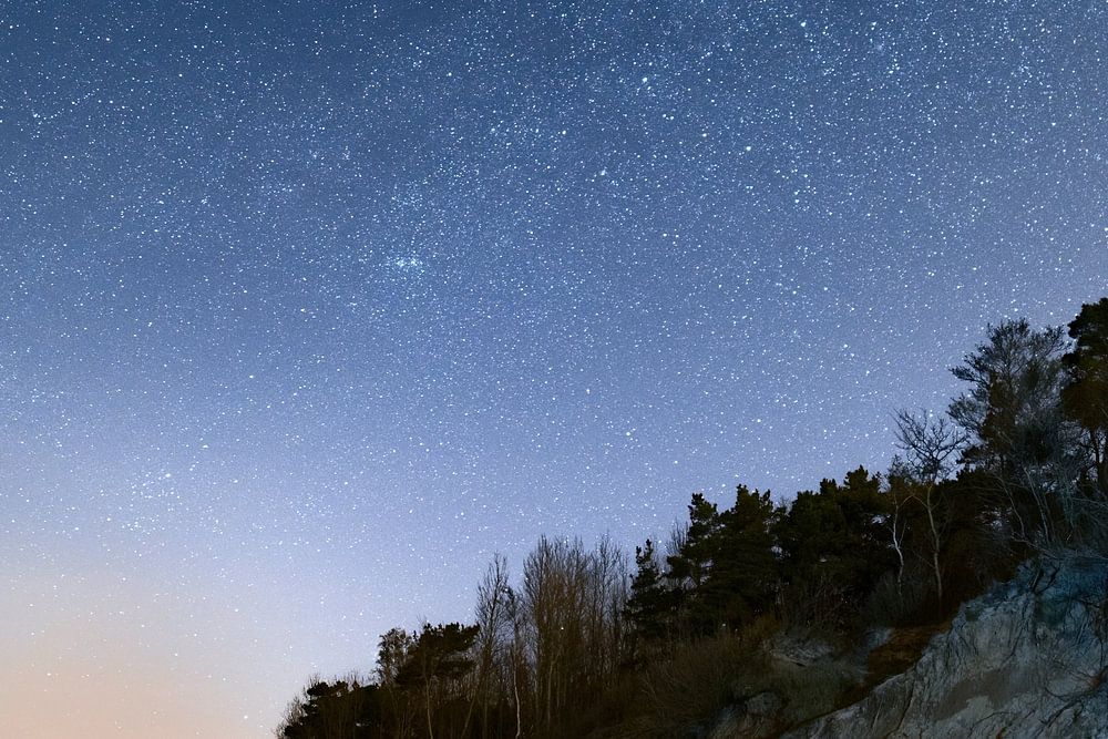 Klarer Nachthimmel am felsigen Strand.
