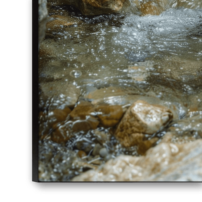 Das Bild zeigt einen klaren, sanft fließenden Bach, umgeben von glatten Steinen und schimmernden Felsen. Die reflektierenden Wasseroberflächen und die sanften Wellen erzeugen ein beruhigendes Ambiente. Die natürliche Schönheit der unberührten Umgebung wirkt einladend und vermittelt ein Gefühl der Ruhe und Verbundenheit mit der Natur.