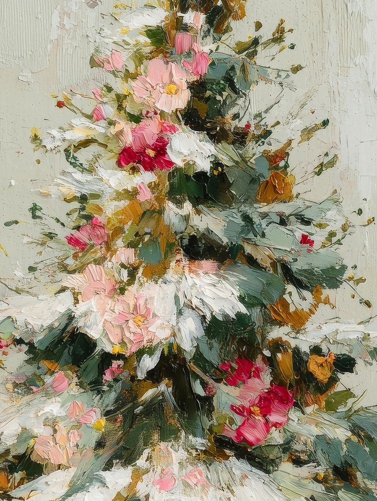 Dieses Gemälde fängt den sanften Zauber einer winterlichen Weihnacht in Farbe und Textur ein. Ein Weihnachtsbaum, bedeckt mit einem Hauch von Schnee, steht im Mittelpunkt vor einem hellen, rustikalen Hintergrund. Zarte rosa und rote Blumen blühen zwischen den Tannenzweigen, eine unerwartete, aber charmante Ergänzung der traditionellen Szene. Die dicken Pinselstriche verleihen dem Werk eine spürbare Tiefe und Wärme. Die Kombination aus natürlichen Grüntönen, pudrigem Weiß und floralen Akzenten schafft eine harmonische Farbpalette. Die raue Textur der Leinwand unterstreicht den handwerklichen Charakter des Ganzen. Dieses Werk strahlt ein Gefühl von Nostalgie, Heiterkeit und festlicher Eleganz aus. Es ist eine Ode an die Schönheit der Einfachheit, an das Licht des Winters und die Poesie der kleinen Details. Ideal für Liebhaber klassischer Kunst mit einer verträumten, winterlichen Atmosphäre.