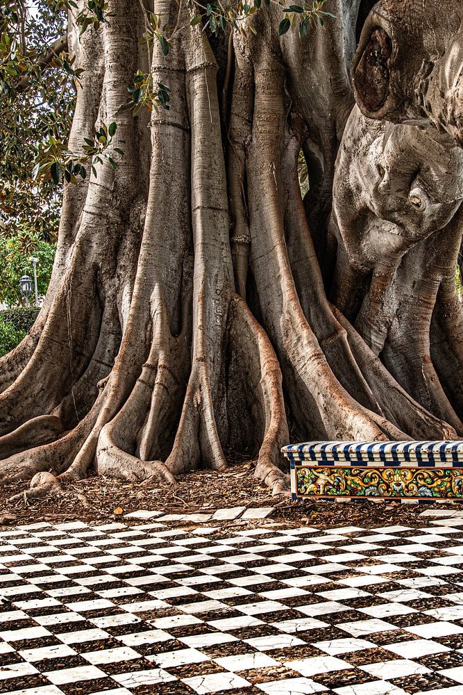 Das schwarz-weiß karierte Muster der Pflasterung des Platzes steht in schönem Kontrast zu den skurrilen Formen des majestätischen Baumes dahinter.