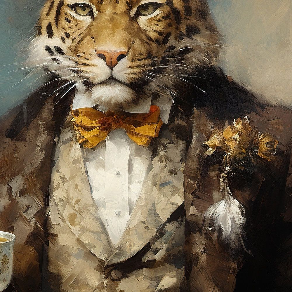 Klassisches Porträt | Edles Leopardenporträt - Hier sehen Sie ein anspruchsvolles Porträt eines geschickt gekleideten Leoparden mit offensichtlich altmodischen, aristokratischen Zügen. Der Leopard ist in einem klassischen Kostüm mit Zylinder und Fliege abgebildet und scheint sogar ein Glas in der Hand zu halten. Die Farben sind überwiegend warm; eine Palette von Brauntönen trägt zur nostalgischen Atmosphäre bei, während der impressionistische Stil des Gemäldes ein zeitloses Gefühl hervorruft.