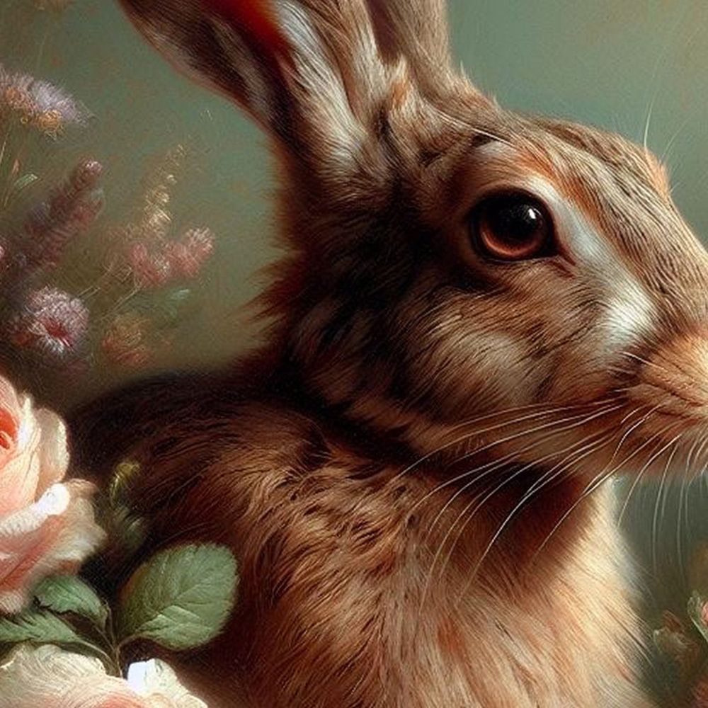 Ein digitales Kunstwerk, inspiriert von alten Gemälden. Ein klassisches Porträt eines Kaninchens, umgeben von rosa und weißen Blumen vor einem grünen Hintergrund.