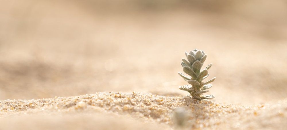 Dieses Bild zeigt eine kleine, tapfere Pflanze, die allein in einer sandigen und trockenen Umgebung wächst. Die reduzierte Farbpalette und die Unschärfe im Hintergrund lenken den Fokus auf das Leben inmitten der Kargheit. Perfekt geeignet für Themen wie Überleben, Resilienz, Naturfotografie oder Minimalismus. Das Bild vermittelt eine emotionale Botschaft von Hoffnung, Stärke und der Schönheit des Lebens in unwirtlichen Bedingungen.