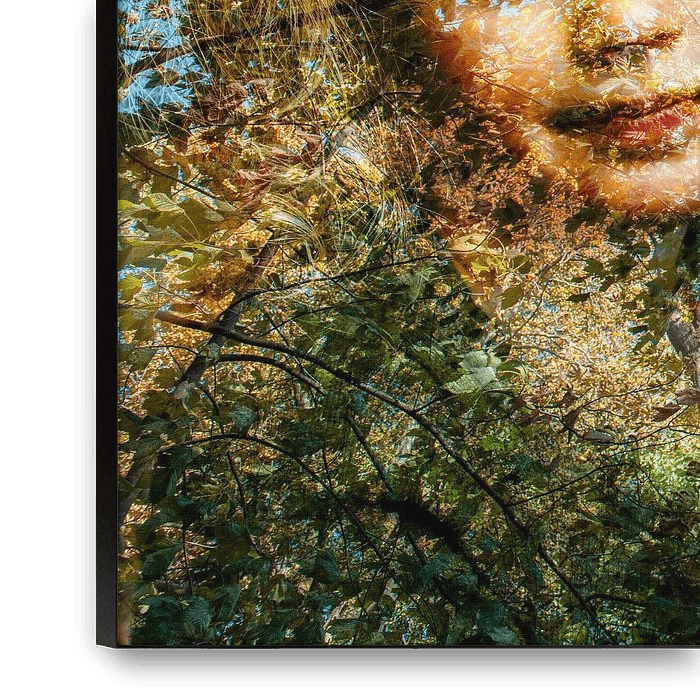 Collage aus dem Porträt eines jungen Mädchens und einem Foto eines schönen Baumes, die Fotos sind übereinandergelegt und digital manipuliert. Eine Elfe im Wald. Eine märchenhafte Atmosphäre und schöne warme, ausdrucksstarke Farben.