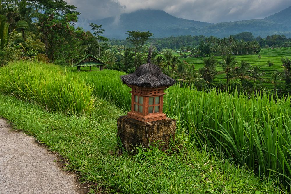 Kleiner Feldweg durch die Reisfelder von Jatiluwih auf Bali. Der Weg, den die Reisbauern mit ihrem Moped oder Traktor nehmen, um zu ihrem Land zu gelangen und ihre Ernte zur Hauptstrasse zu transportieren.