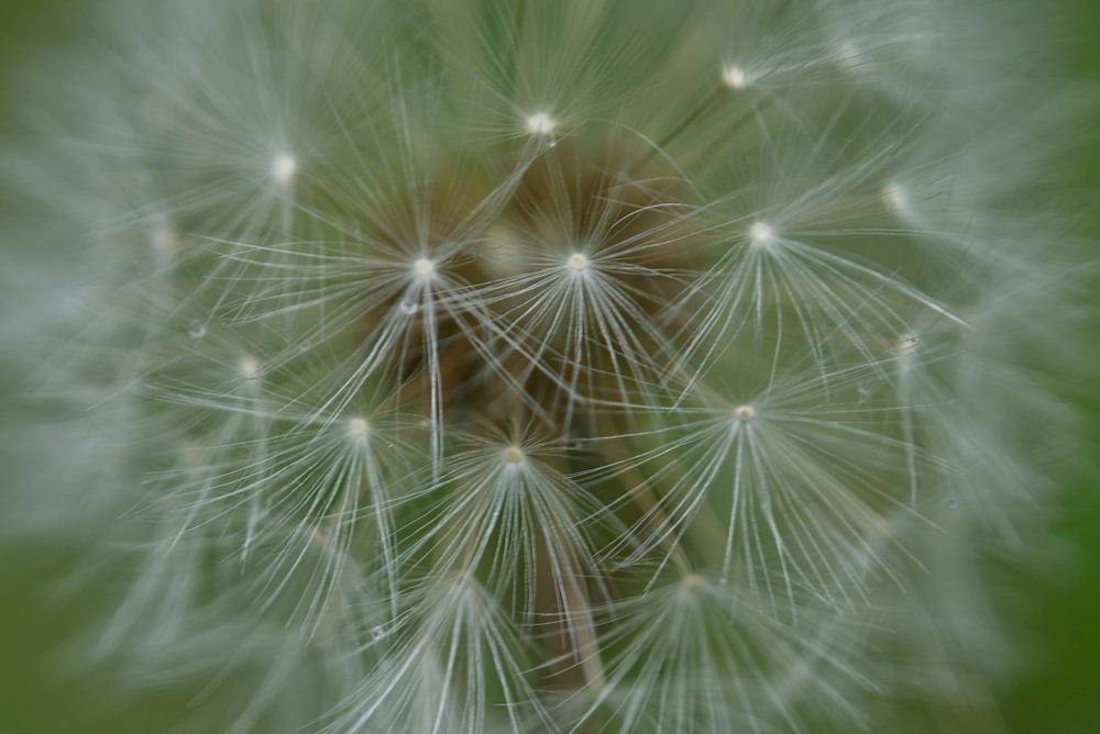 Kleiner Pusteblumen-Kopf auf Grün - ein kleiner Pusteblumen-Kopf mit dem Fokus auf der Außenseite der Fallschirme. Die Ränder des Pusteblumenkopfes fallen in den Weichzeichner. Der Hintergrund ist ein mittleres bis leichtes Hellgrün. Im Hintergrund befindet sich ein Pusteblumenball, der gerade herunterfällt.