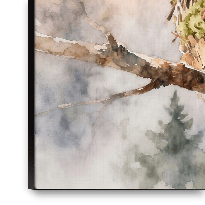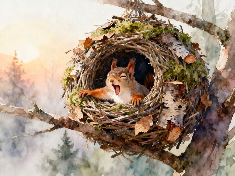 Ein Eichhörnchen reckt sich in seinem kunstvoll geflochtenen Kobel und gähnt herzhaft dem neuen Tag entgegen. Umgeben von Zweigen, Moos und zarten Herbstblättern entsteht eine intime, geschützte Szene hoch oben im Baum. Die weiche Aquarelltechnik verleiht dem Motiv Wärme und Natürlichkeit.