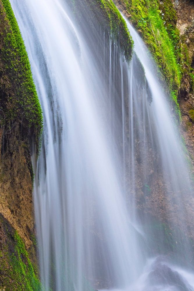 Wasserfall mit grünem Moos, Gras und Fels im Frühling. Allgäuer Alpen, Bayern, Deutschland, Europa
