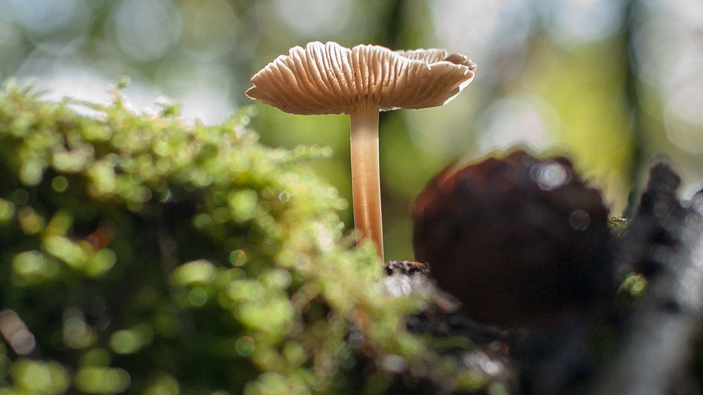 Brown beleuchtete Pilz im Wald. Makropilz auf einem alten faulen Baumstamm umgeben mit Herbstfarben, -zweigen und -blättern. Herbstszene mit unscharfem Hintergrund und bokeh mit atmosphärischem Herbstlicht. in einem niederländischen Wald an der Veluwe.
