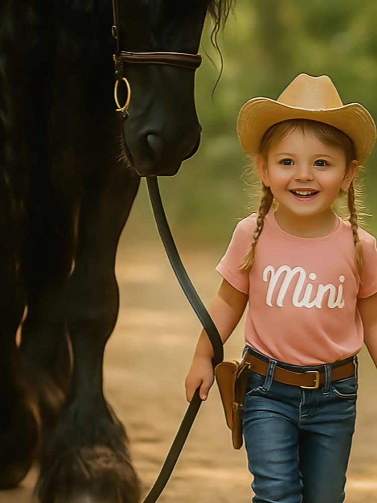 Ein zartes und kraftvolles Bild, in dem die Reinheit der Kindheit auf die Majestät des Pferdes trifft. Das Mädchen mit Cowboyhut, Stiefelchen und einem breiten Lächeln strahlt ungehemmte Freude aus, während der imposante schwarze Hengst sie ruhig begleitet. Dieses Bild strahlt Vertrauen, Freundschaft und den Zauber der Natur aus - eine Ode an die besondere Verbindung zwischen Mensch und Tier.