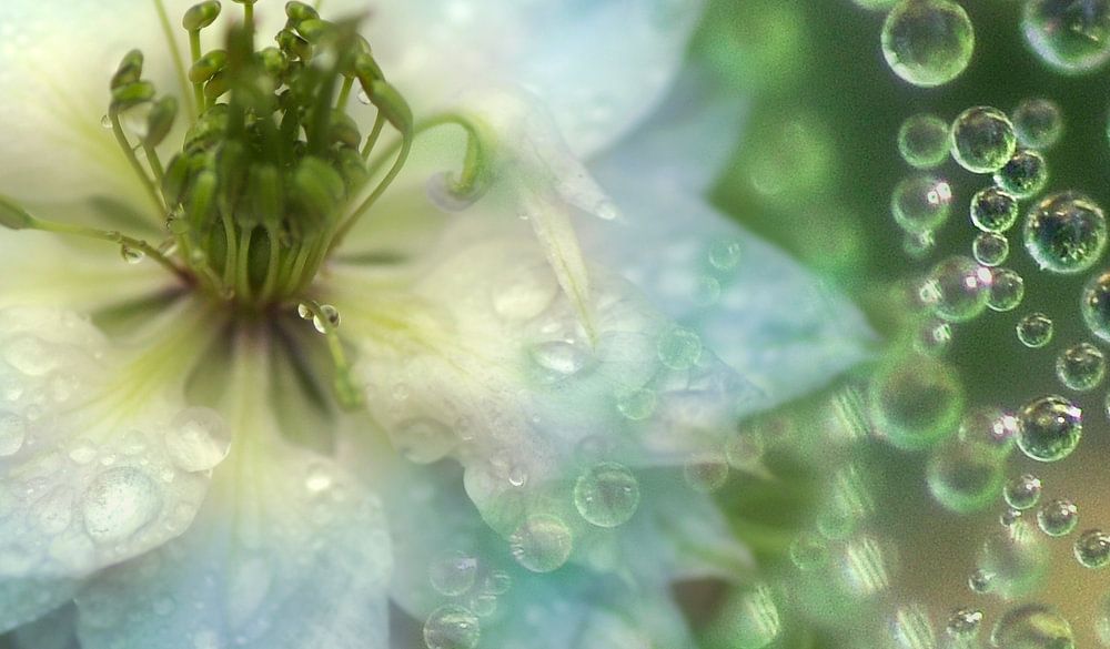 Eine Fotokombination aus einer Miss in Green (Blume) und einem Spinnennetz im Gras mit Tautropfen.