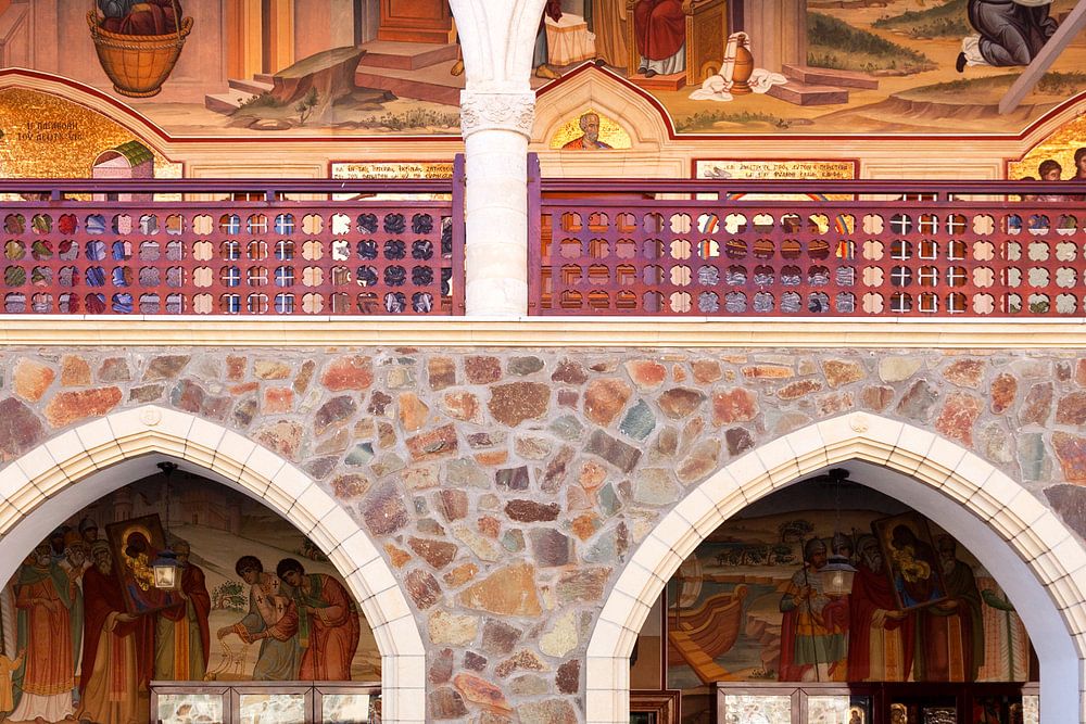 Bogengang mit Wandmalereien und Wandmosaiken, Kloster Kykkos, Troodos Gebirge, Südzypern, Zypern