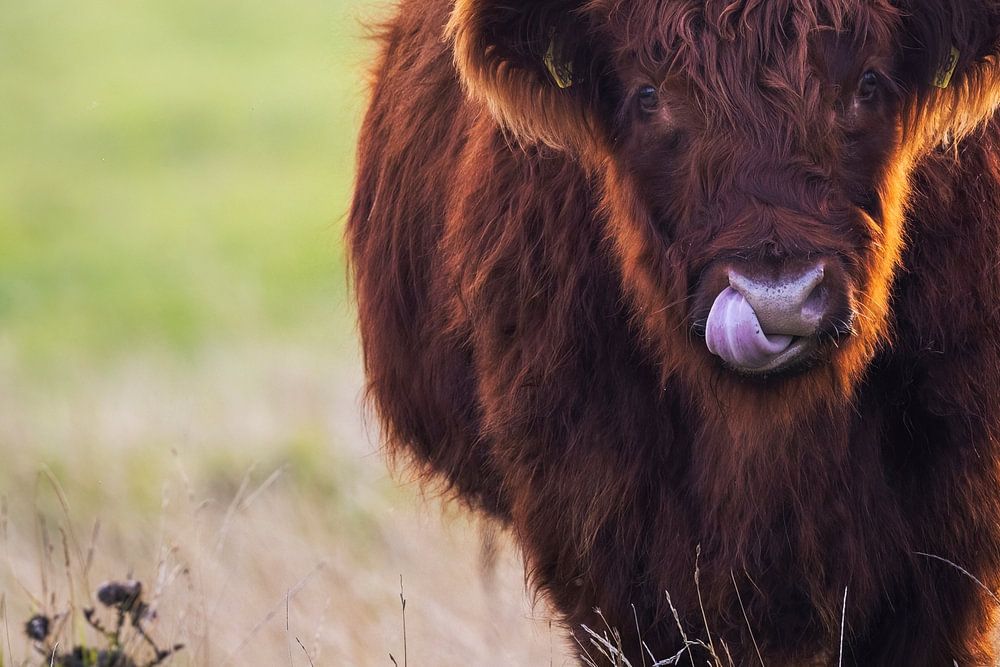 Ein schottisches Hochlandrind steht auf einer Weide im Norden Deutschlands.