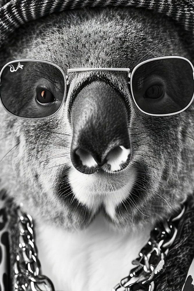 Ein Koala in Schwarz-Weiß mit Hut und Sonnenbrille, der stilvoll und trendy aussieht. Perfekt für humorvolle und kreative Projekte.