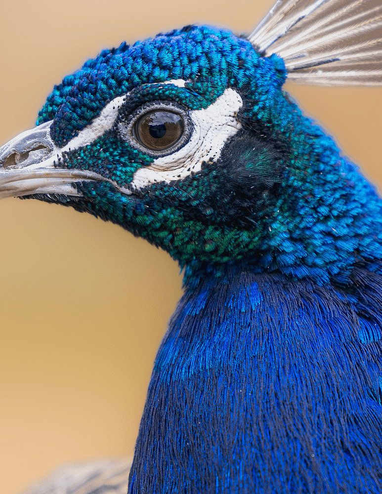 Dieses Bild zeigt eine wunderschöne Nahaufnahme eines Pfaus, auf der die intensiven blauen Farben seines Gefieders und die feinen Details seines Kopfes besonders gut zur Geltung kommen. Der Kamm und das Muster in den Federn machen das Bild zu etwas ganz Besonderem. Der weiche, ruhige Hintergrund lässt den Pfau besonders gut zur Geltung kommen.