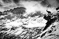 Diese beeindruckende Schwarz-Weiß-Komposition zeigt einen Alpensteinbock (Capra ibex) in seinem natürlichen Lebensraum. Das Tier steht als kraftvolle Silhouette auf einem schroffen Felsen auf der rechten Seite des Bildes und blickt über einen tiefen Abgrund.