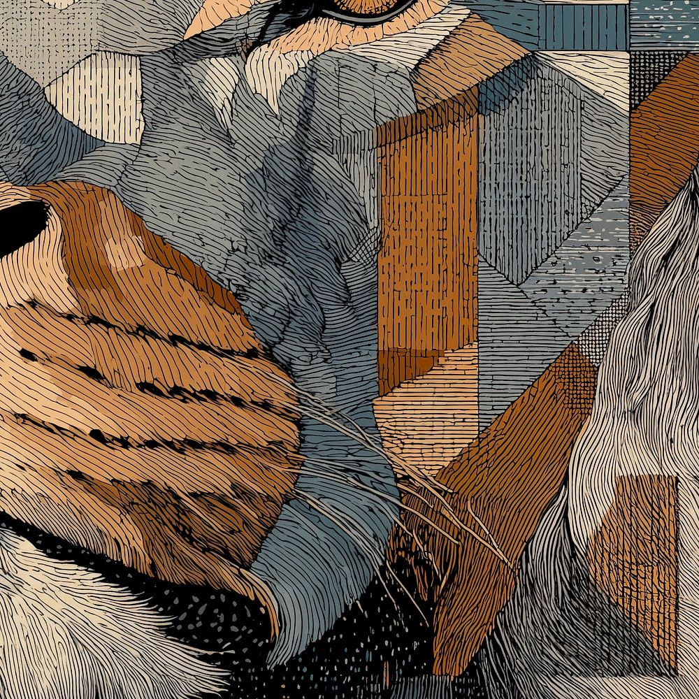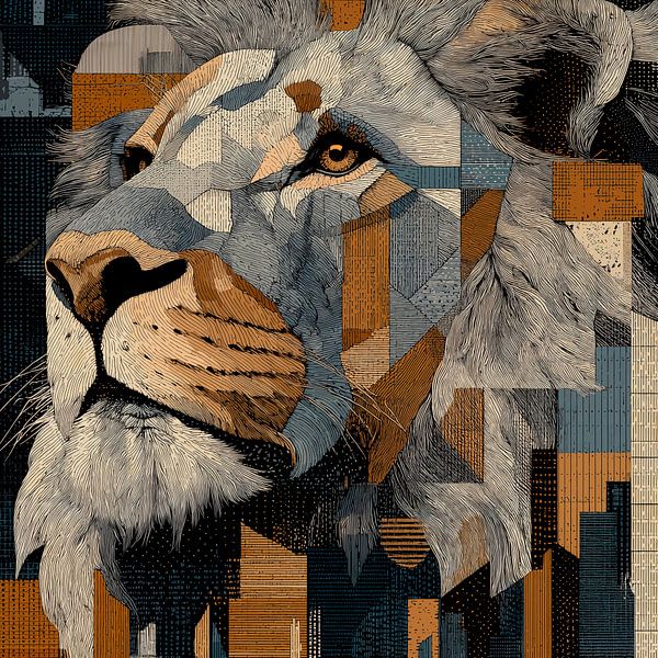 Ein geometrisches, kubistisches Porträt eines Löwenkopfes, das aus scharfen, kantigen Formen in Grau-, Weiß- und Brauntönen besteht. Der Gesamteindruck ist eine kraftvolle und stilisierte Darstellung des Königs des Dschungels.