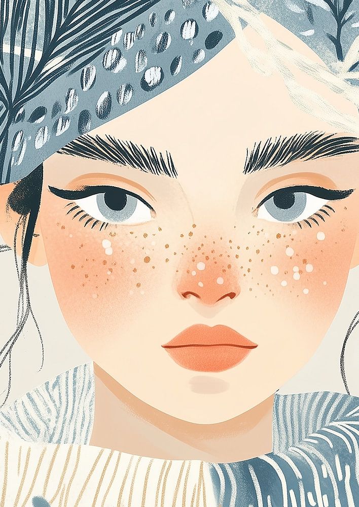 Eine moderne Illustration einer Frau mit Haaren, die feinen, winterlichen Zweigen ähneln und in sanften Grau- und Blautönen gehalten sind. Sie blickt geradeaus, mit einem ruhigen, aufmerksamen Blick, der sofort anziehend wirkt. Sie trägt einen warmen, gemütlich wirkenden Rollkragenpullover mit verschlungenen Mustern in gedeckten Weiß-, Blau- und Beigetönen. Kleine goldene Akzente verleihen ihrem Outfit einen Hauch von Eleganz. Der Hintergrund ist hell und hat Pastelltöne, die eine minimalistische Winteratmosphäre hervorrufen, mit einem Hauch kühler, eisiger Farbe, die dem Ganzen eine heitere Einfachheit verleiht.