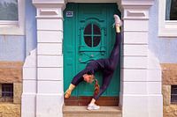 Turnerin in Pose eines Altstadthauses.