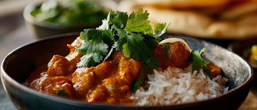 Ein verlockender Anblick von aromatischem Curry, das liebevoll auf dampfendem Reis angerichtet ist, umgeben von frischem Koriander und knusprigem Brot. Diese Farb- und Geschmacksvielfalt bringt die Sinne zum Tanzen und eignet sich hervorragend für die Küche, wo sie die Freude am Kochen und Genießen unterstreicht.